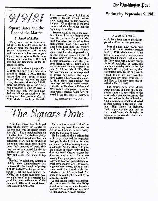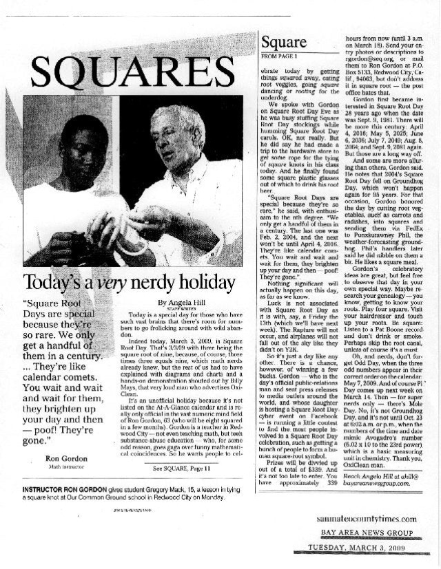 We've established a contest with two prize packets. Each group of winners will share the date in dollars---$552.5. One packet will be divided among 25 U.S. winners. A second grouping will share the international prize, also totaling $552.5. The winners will be those who involve the most people in a Square Root celebration. Entries can include creating the largest square root sign from people, serving rootbeer in square glasses to the most folks, or cutting many roots into squares (well, cubes) for a square root stew.